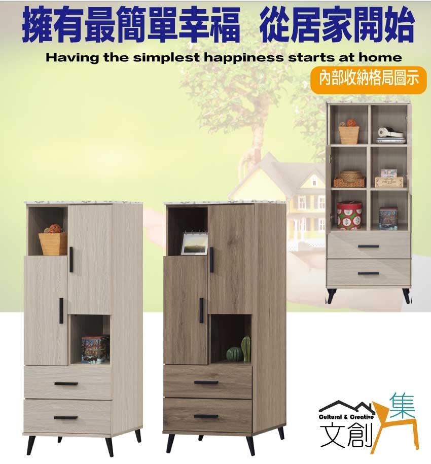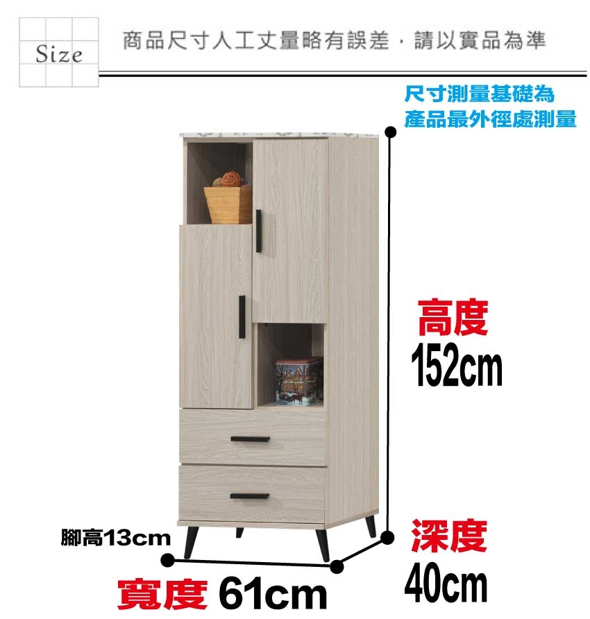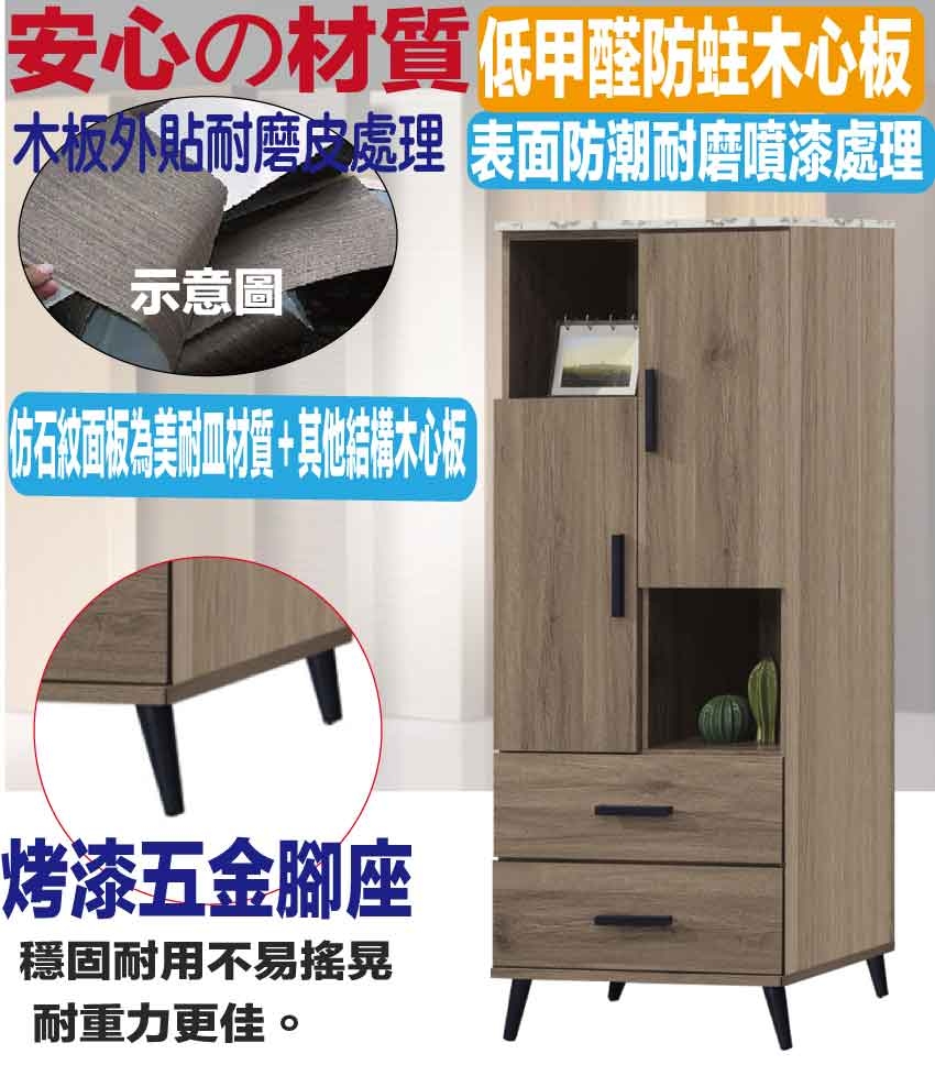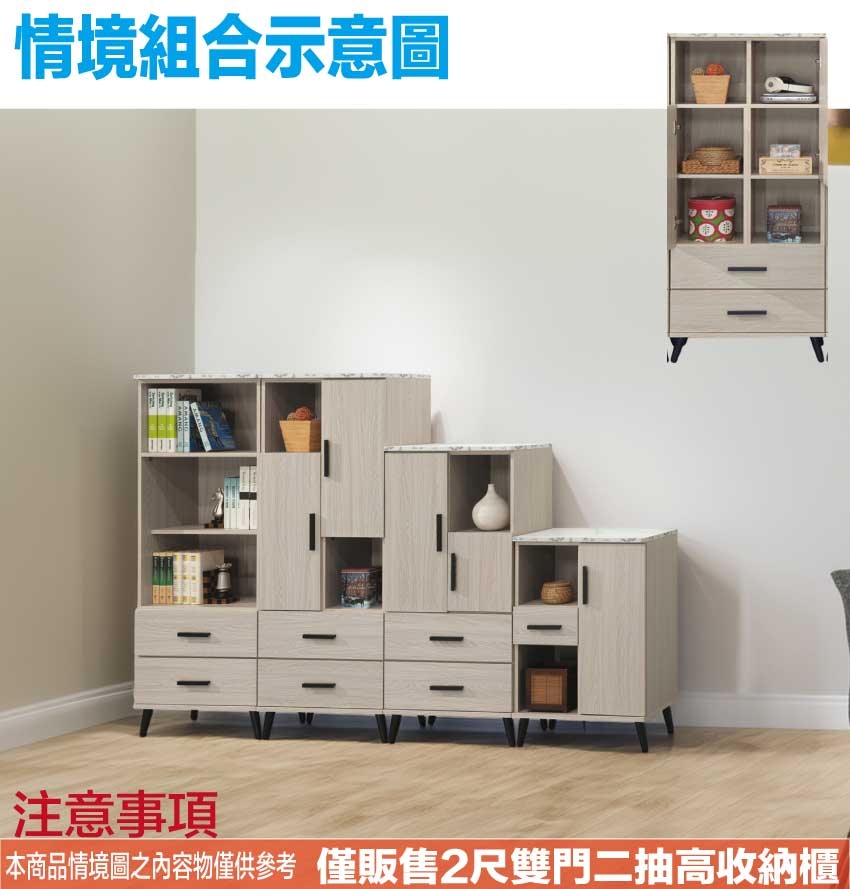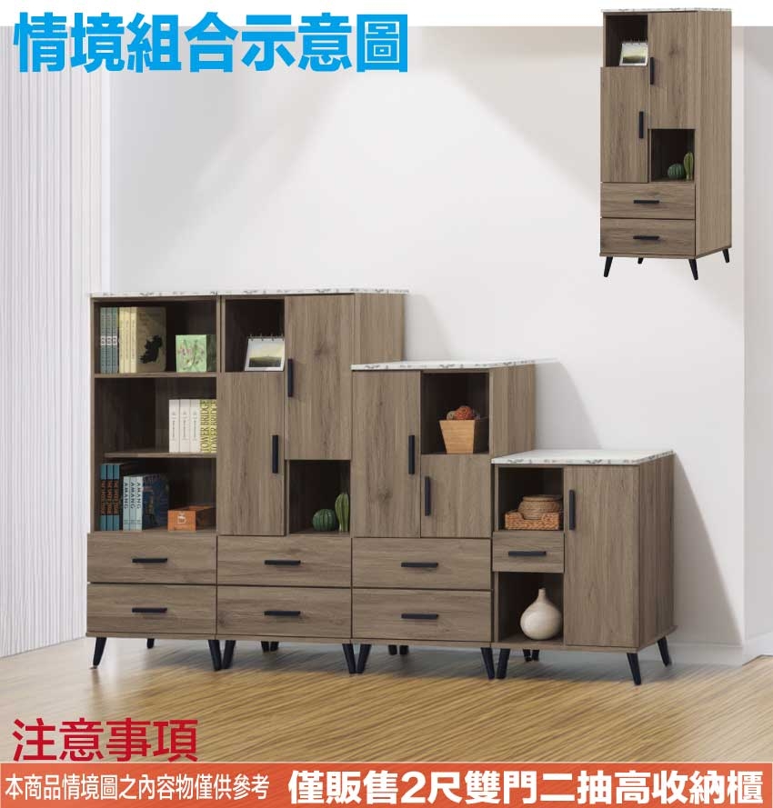 愛克2尺二門二抽高收納櫃/餐櫃櫃(二色可選) 尺寸:(寬)61x(深)40x(高)152/公分 ◆材質: 材質:防蛀木心板+烤漆五金腳座+防夾手緩衝門片五金+面板採用耐磨仿石紋美耐皿材質 - ◎注意事項: