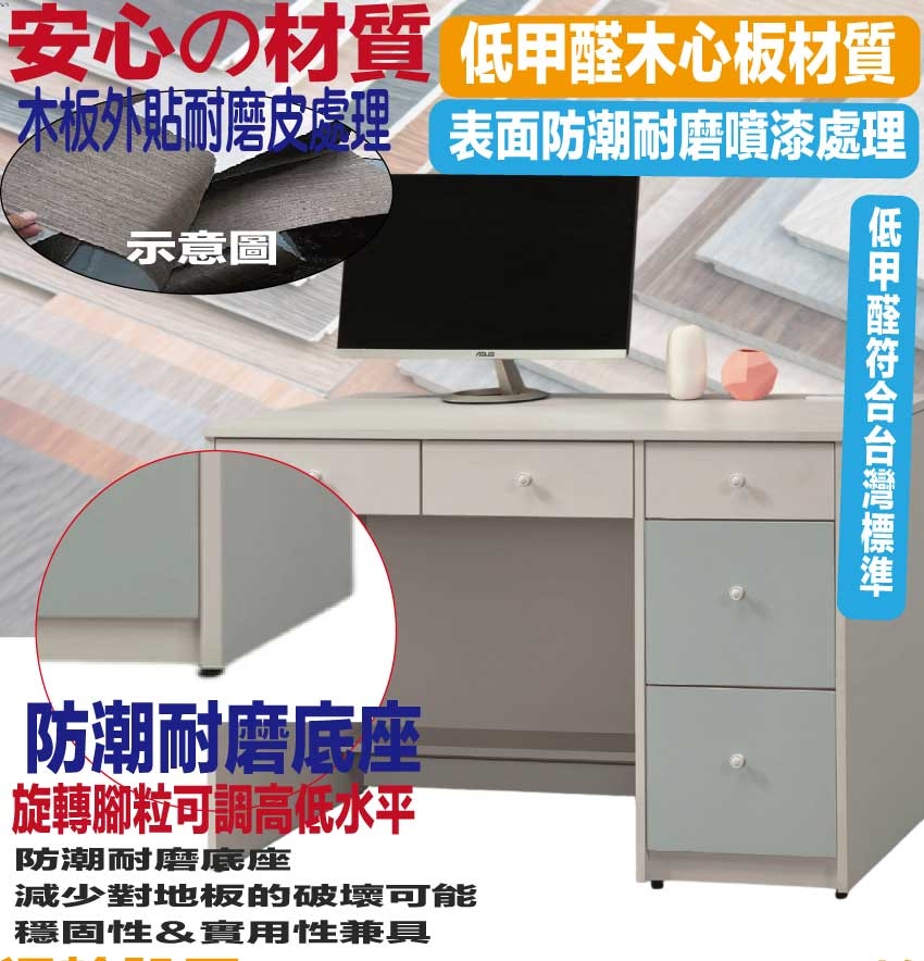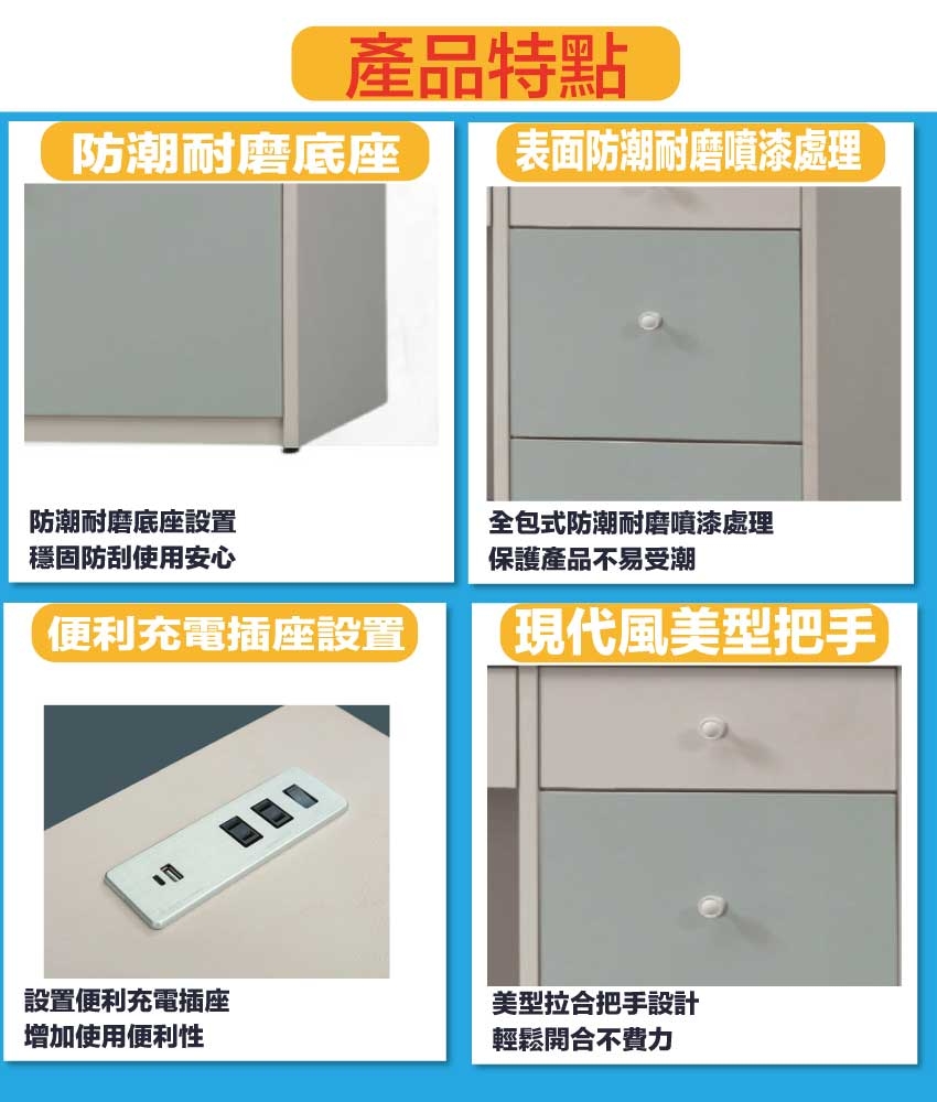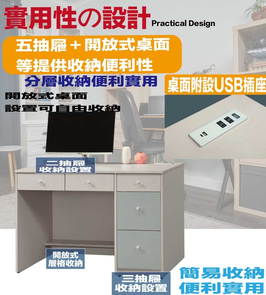 • 五抽屜+開放桌面+便利插座