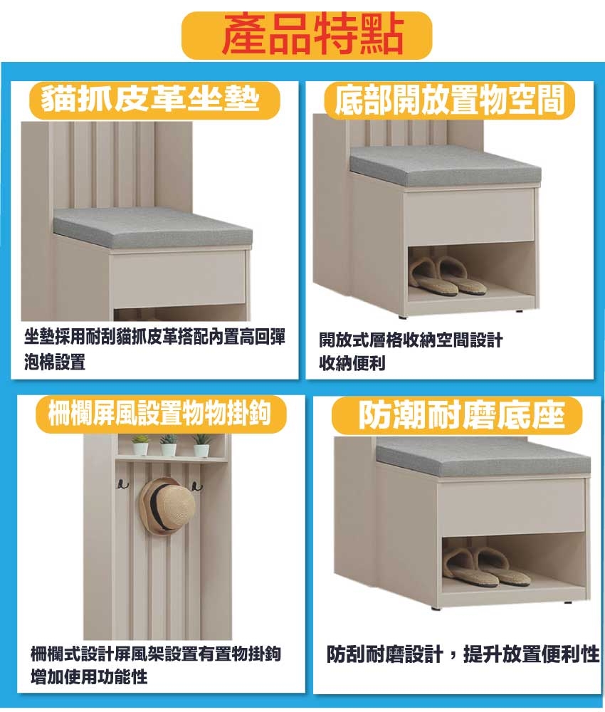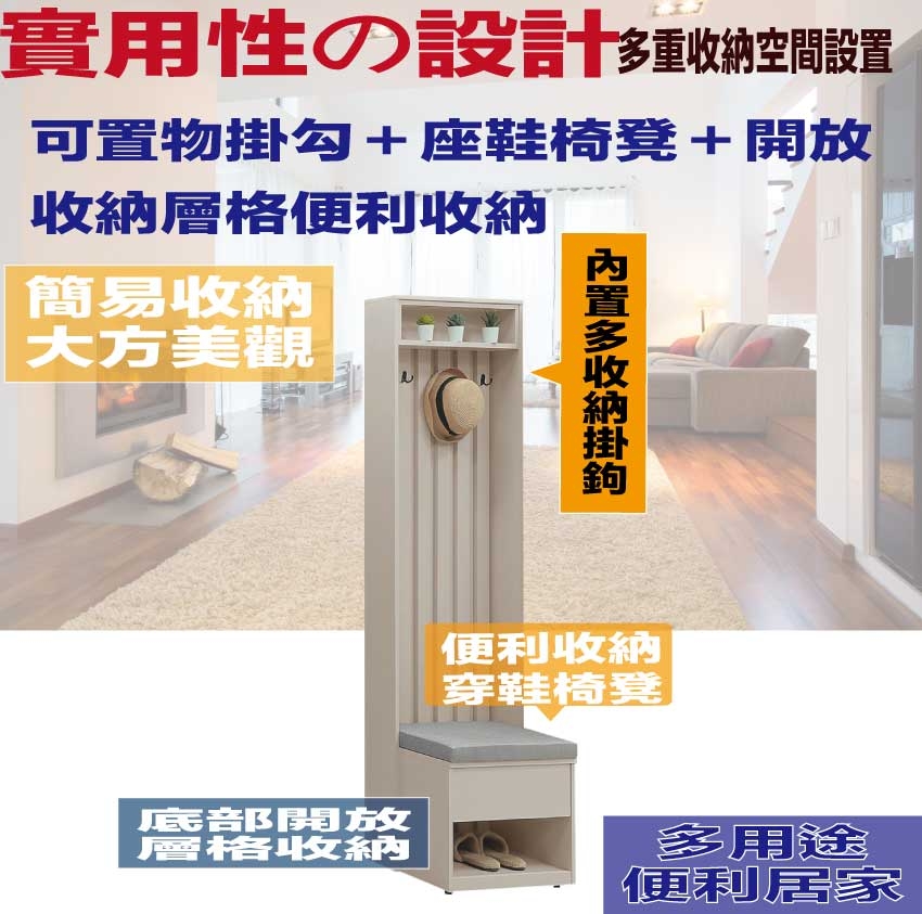• 內置收納置物掛勾+穿鞋坐墊