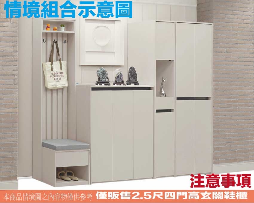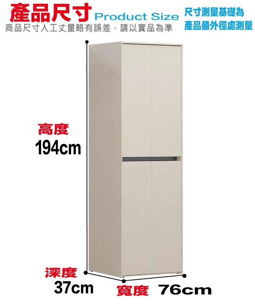 特2.5尺四門高玄關櫃/高鞋櫃 尺寸:(寬)76x(深)37x(高)194/公分 ◆材質: 材質:防蛀木心板+防潮耐磨底座(可旋轉調整腳粒)+防夾手緩衝門片五金+崁入式美背處理 - ◎注意事項: