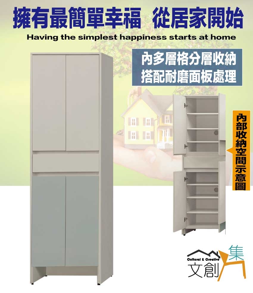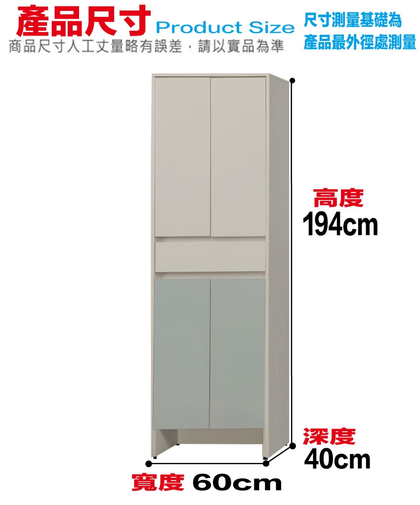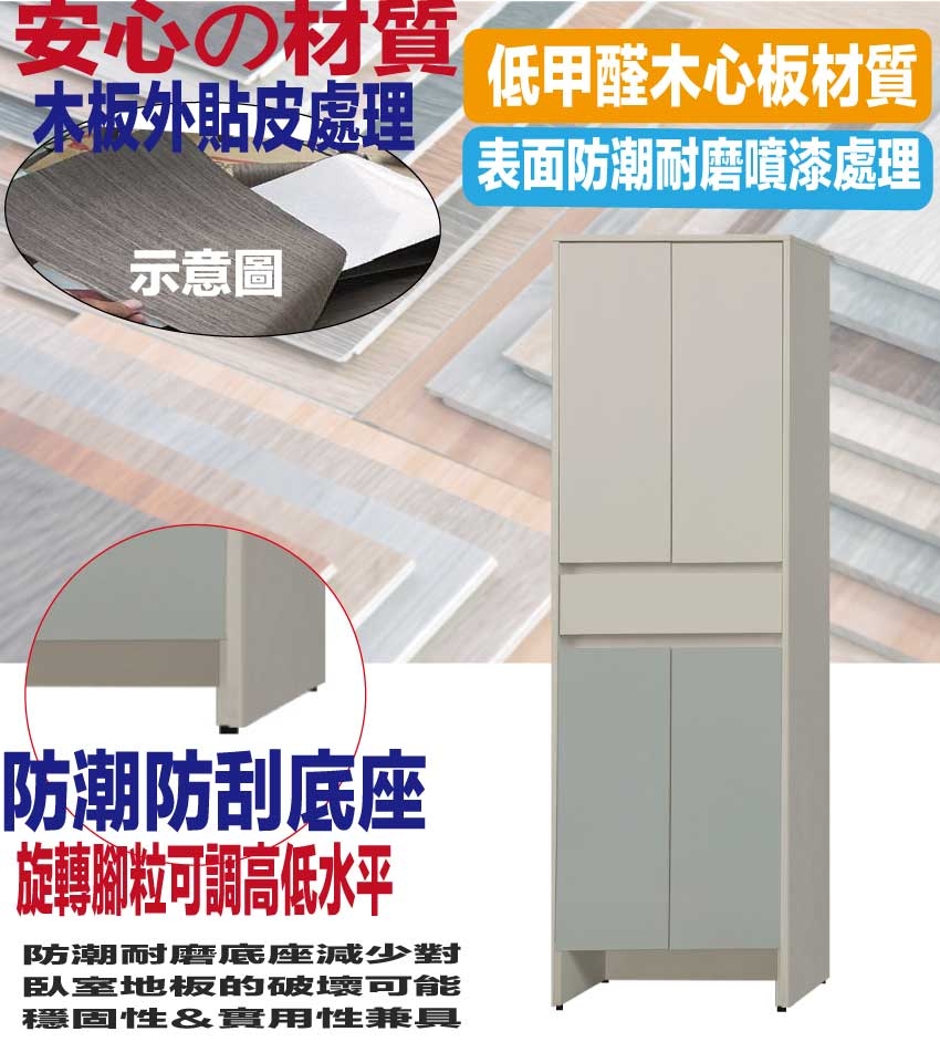 卡黛2尺四門二抽玄關櫃/高鞋櫃 尺寸:(寬)60x(深)40x(高)194/公分 ◆材質: 材質:防蛀木心板+防潮耐磨底座(可調高低水平)+防夾手緩衝門片五金+面板採用皮革紋路特殊耐磨處理 - ◎注意事項: