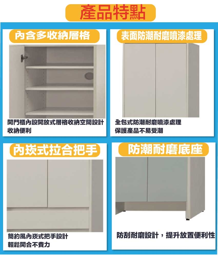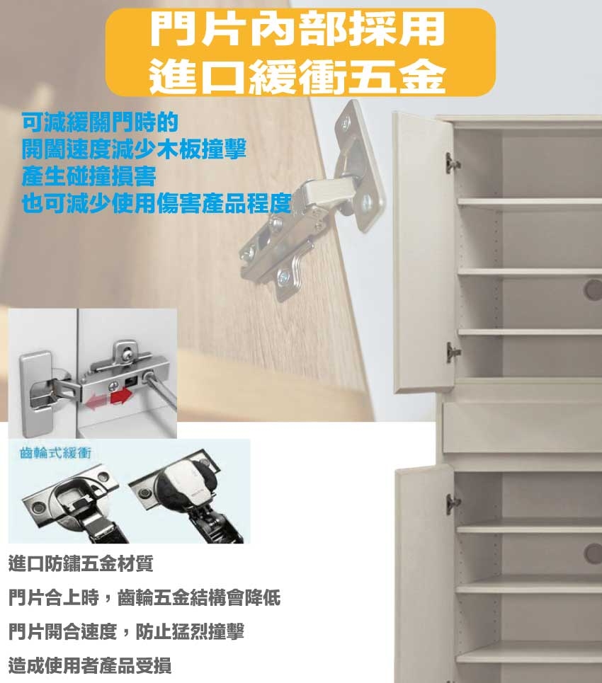 防蛀木心板+防潮耐磨底座(可調高低水平)+防夾手緩衝門片五金+面板採用皮革紋路特殊耐磨處理等安心材質製造