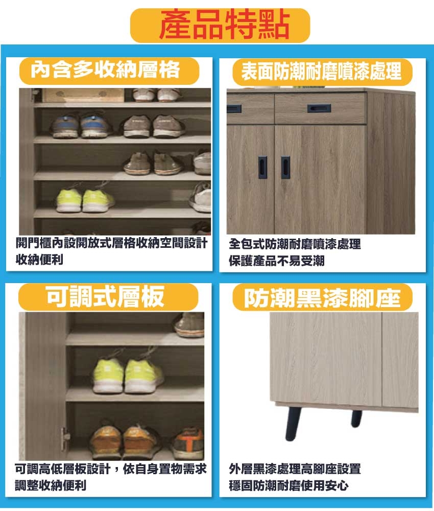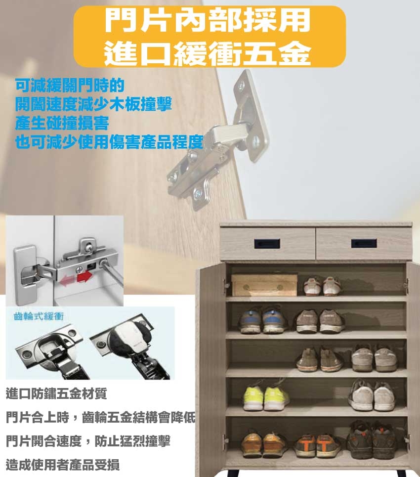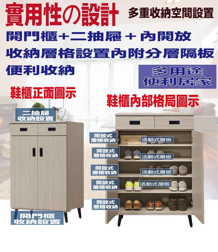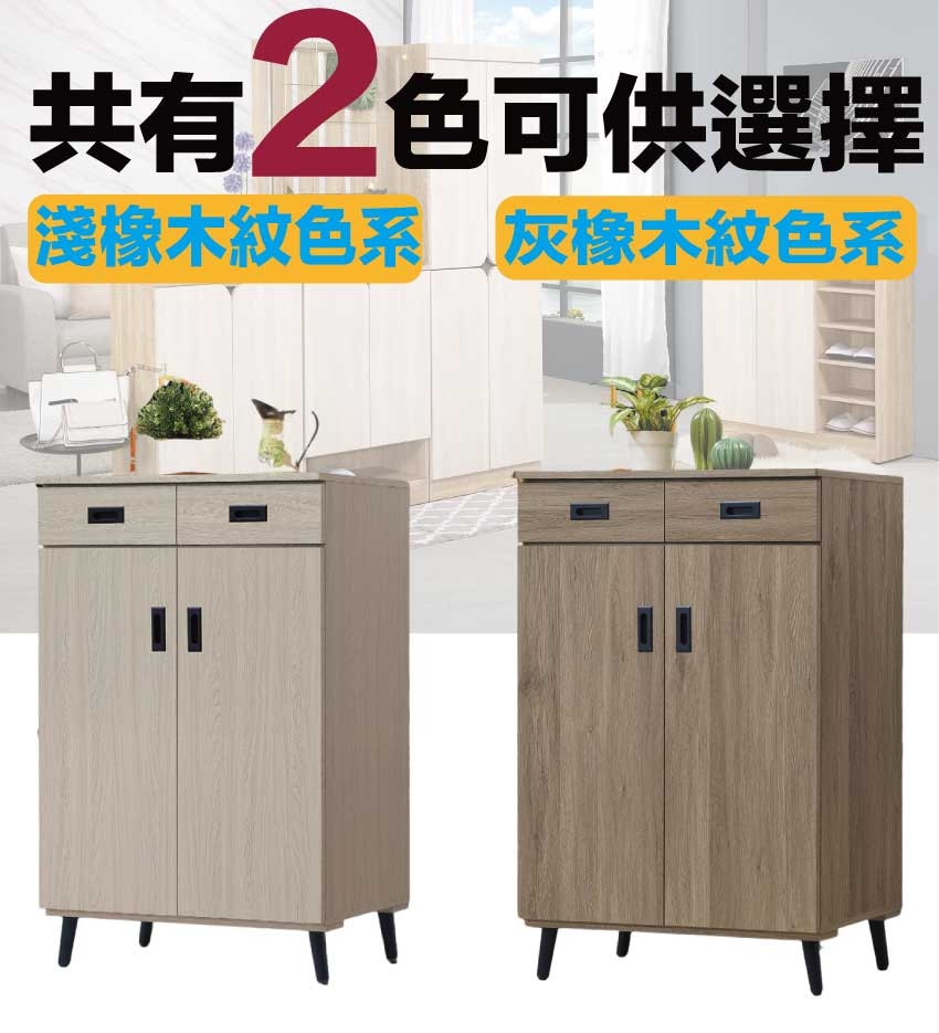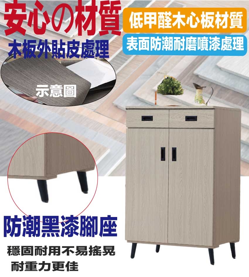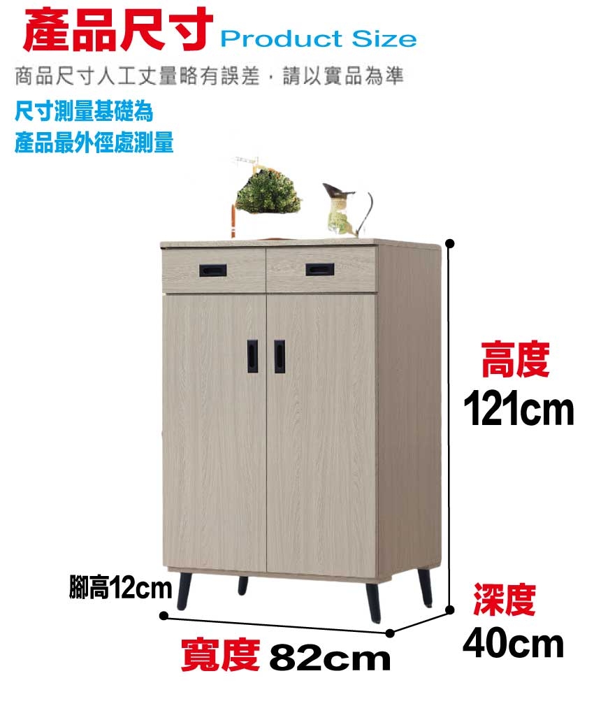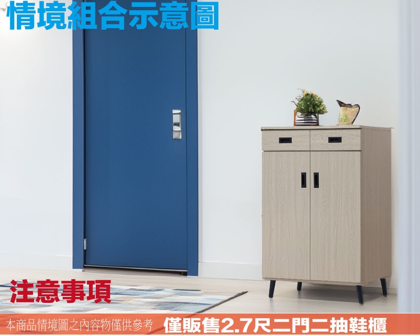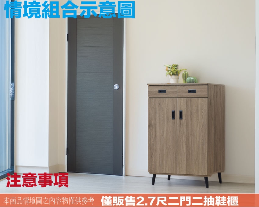 愛克2.7尺二門二抽低鞋櫃(二色可選) 尺寸:(寬)82x(深)40x(高)121/公分 ◆材質: 材質:防蛀木心板+防潮黑漆腳座+防夾手緩衝門片五金 - ◎注意事項:
