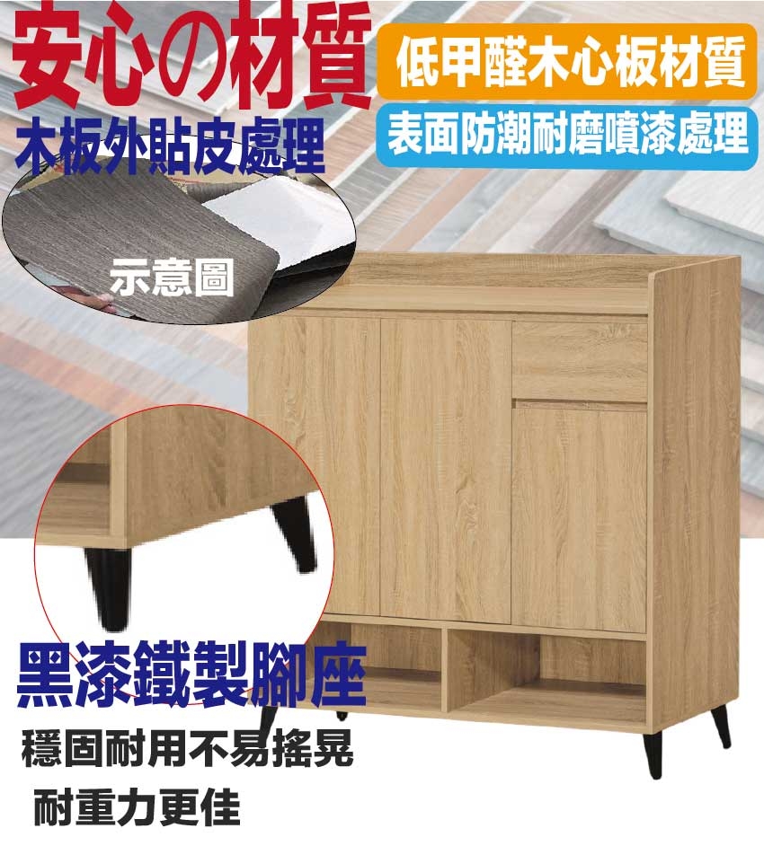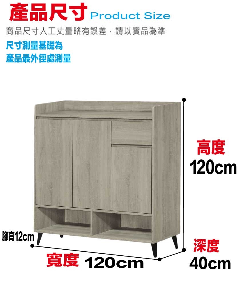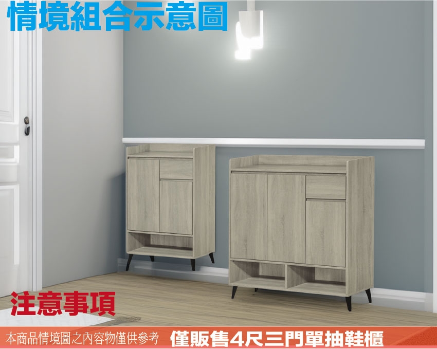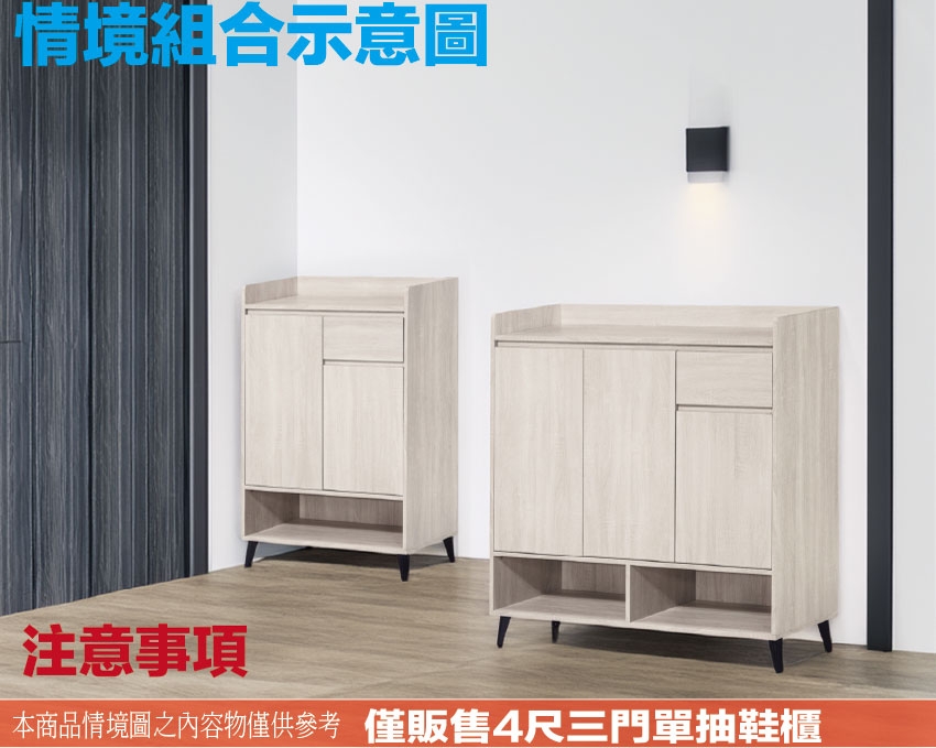 愛坦4尺三門單抽低鞋櫃(三色可選) 尺寸:(寬)120x(深)40x(高)120/公分 ◆材質: 材質:防蛀木心板+烤漆五金腳座 - ◎注意事項:
