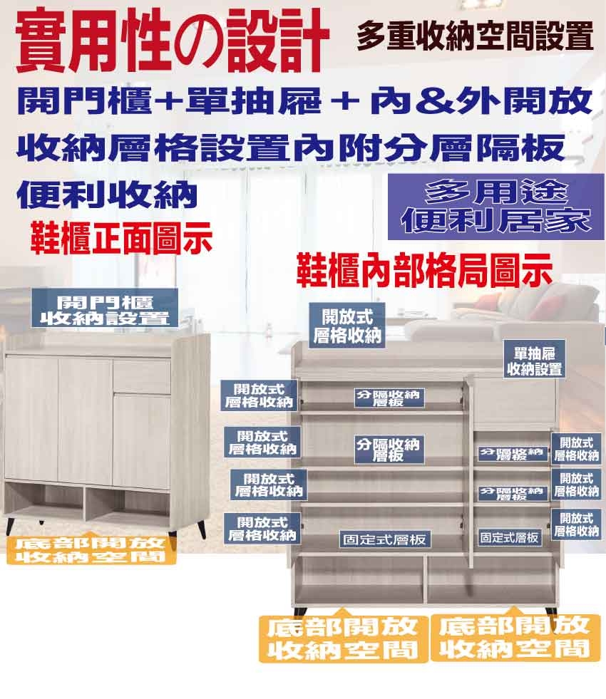 採用開門櫃+單抽屜+內&外開放式層格等收納空間設計