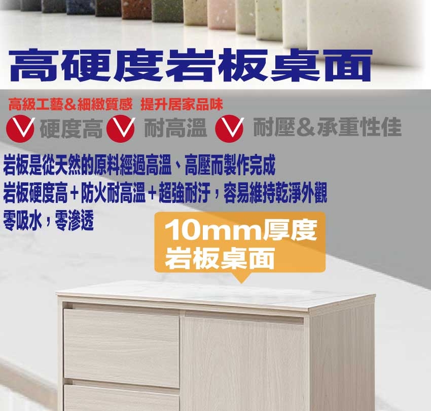 材質:防蛀木心板+防潮木質腳座(底部為防刮腳粒)+10mm高硬度岩板桌面板+防夾手緩衝五金
