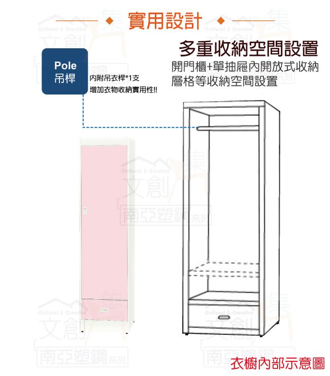 搭配門櫃+吊衣桿+單抽屜+內開放式收納等便利設計