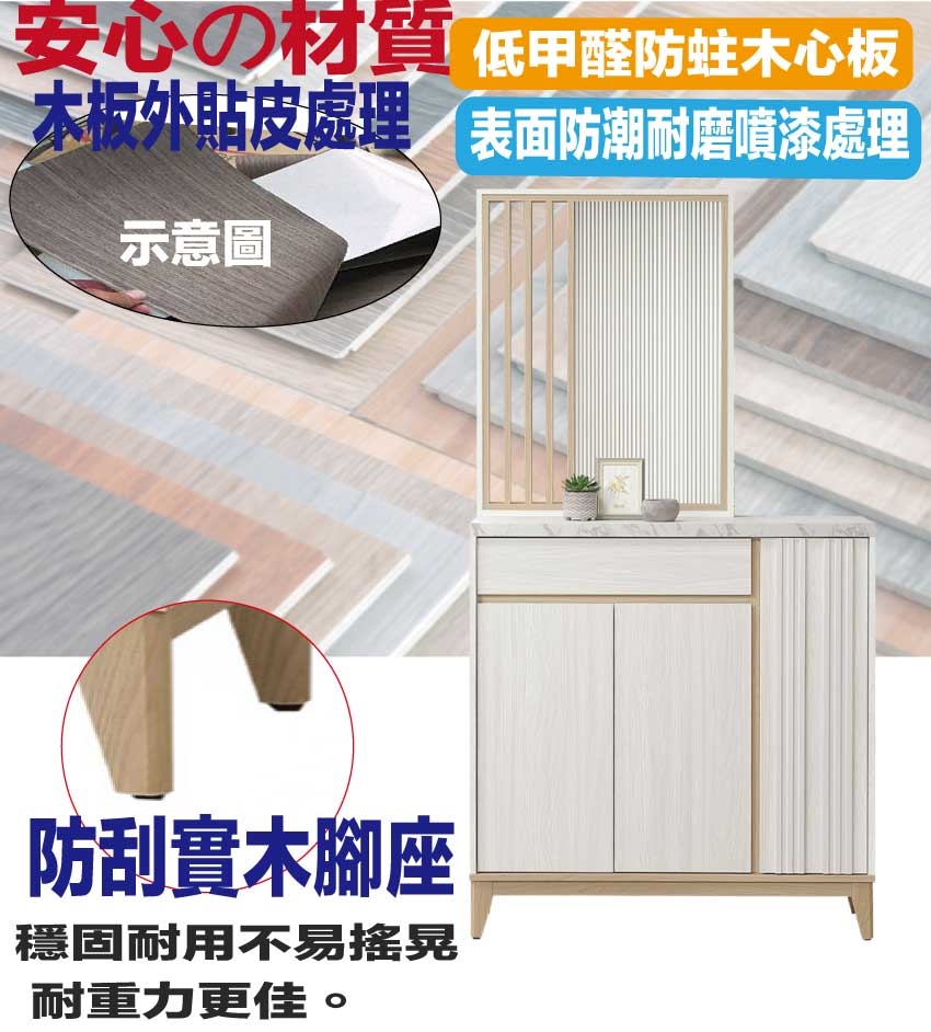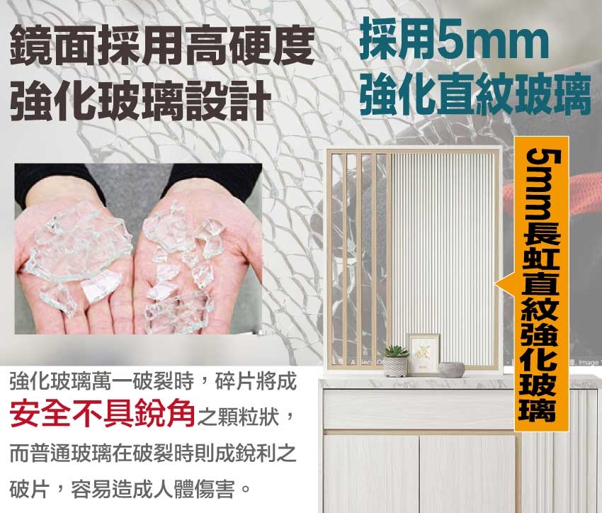 採用防蛀木心板+防刮實木腳座+五金滑軌結構+仿大理石紋耐磨美耐皿材質桌面板+防夾手緩衝門片五金+5mm長虹直紋玻璃等安心材質製造