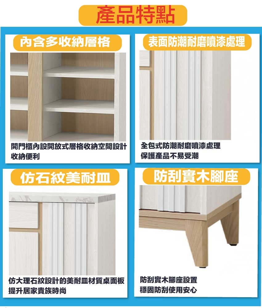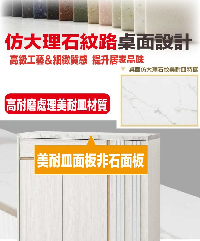 材質:防蛀木心板+防刮實木腳座+五金滑軌結構+5mm長虹直紋玻璃+仿大理石紋耐磨美耐皿材質桌面板+防夾手緩衝門片五金