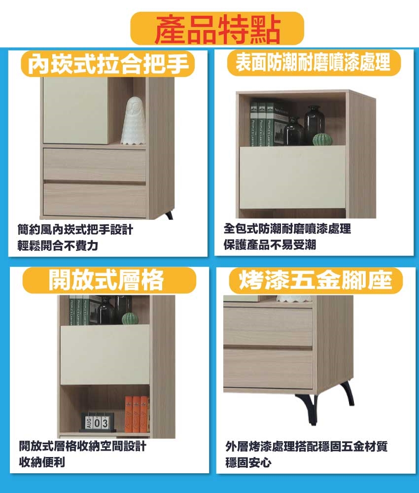 材質:防蛀木心板+烤漆金屬腳座+防夾手緩衝門片五金
