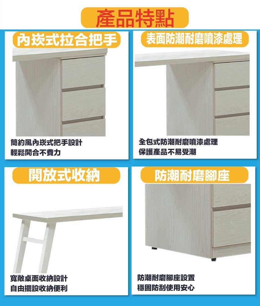 搭配採用三抽屜+開放式桌面等收納空間設計