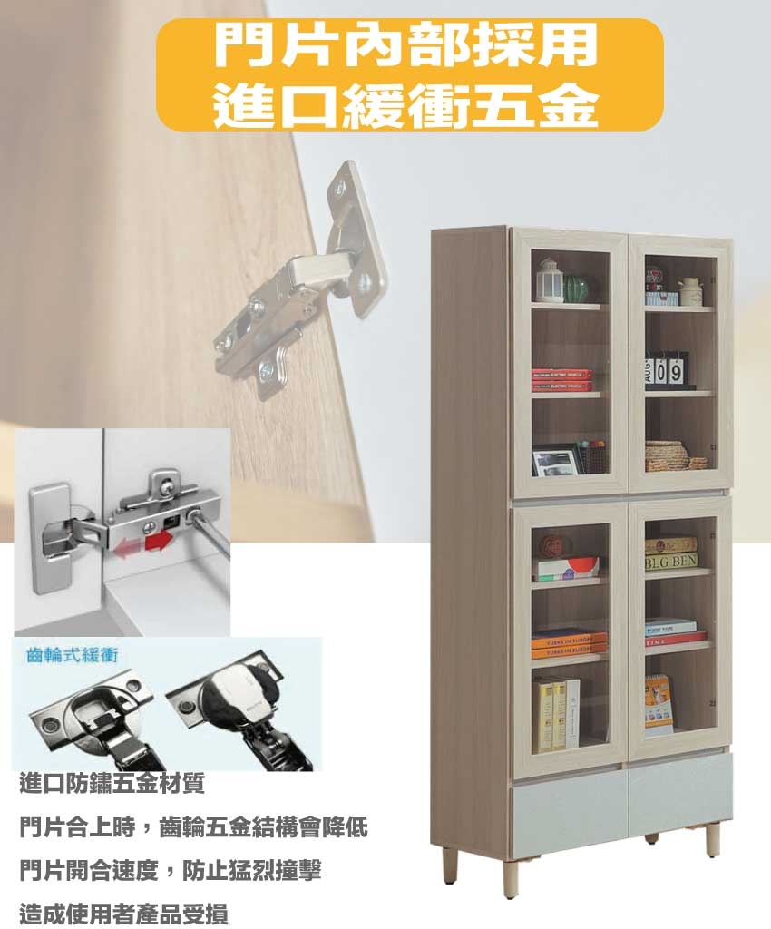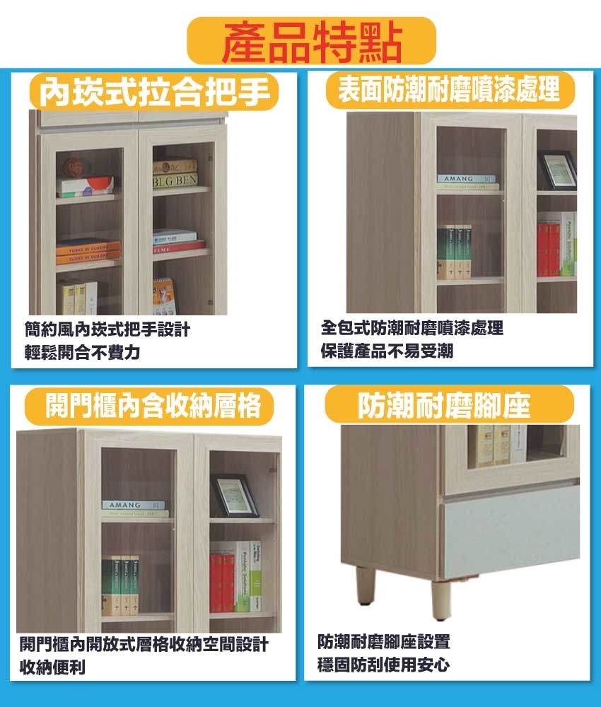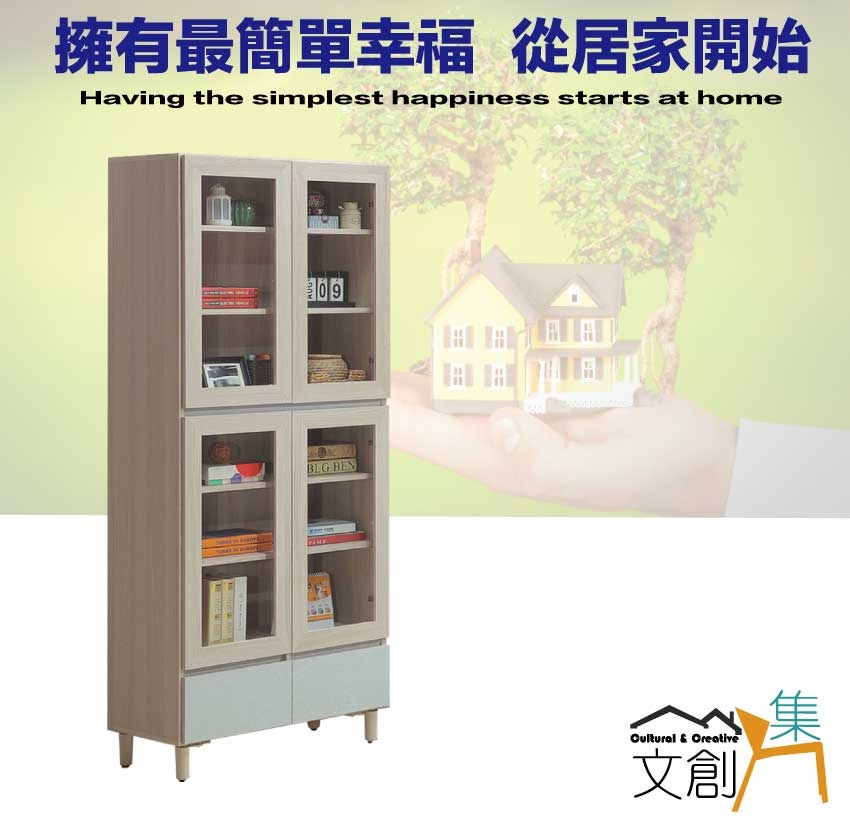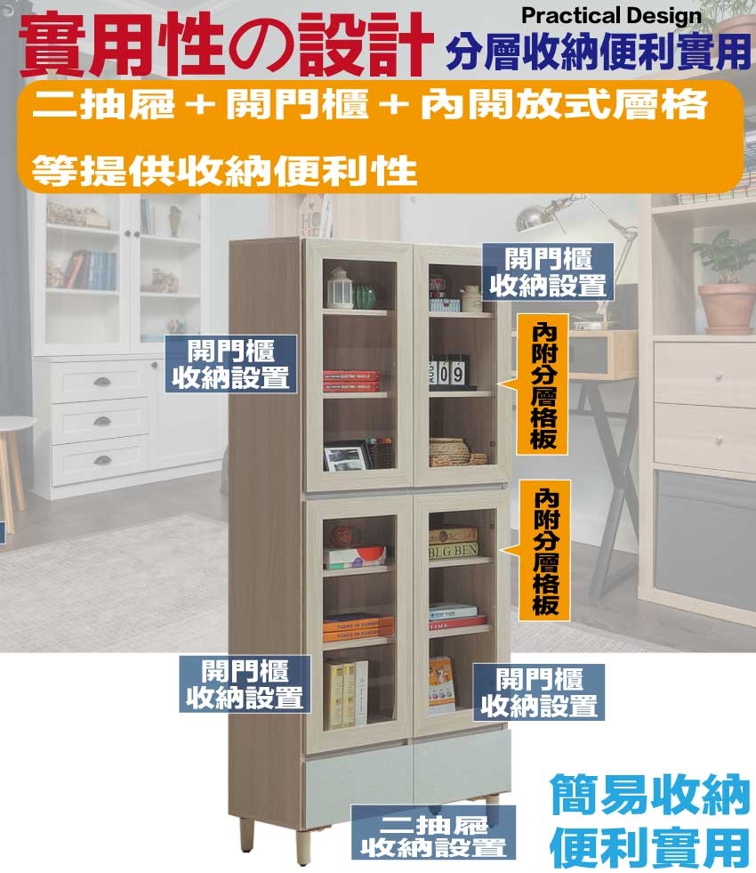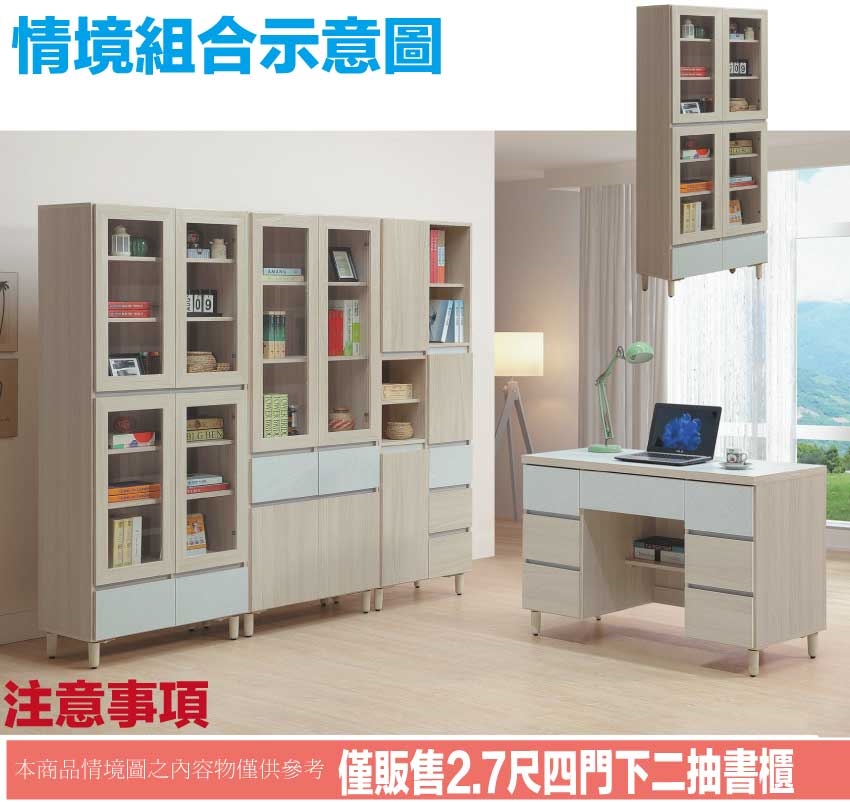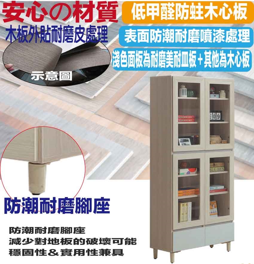 - ◆產品名稱:【綠家居】馬蘭雙色2.7尺下二抽四門書櫃