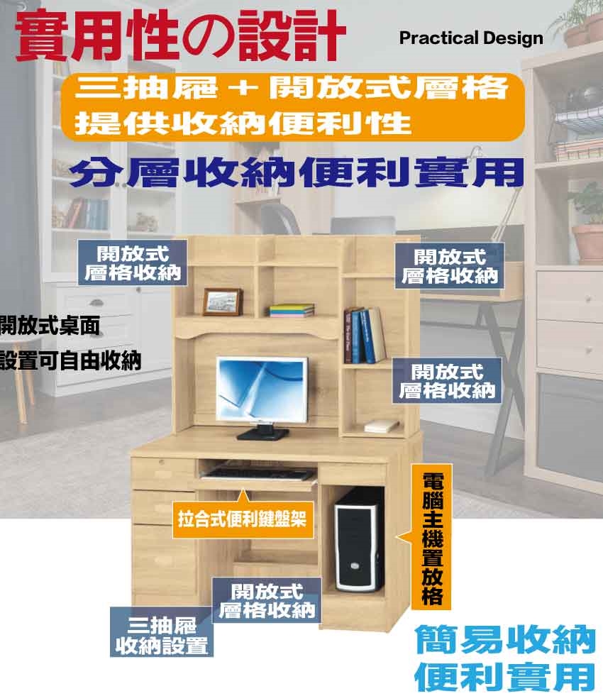 搭配採用拉合鍵盤架+三抽屜+開放層格等收納空間設計