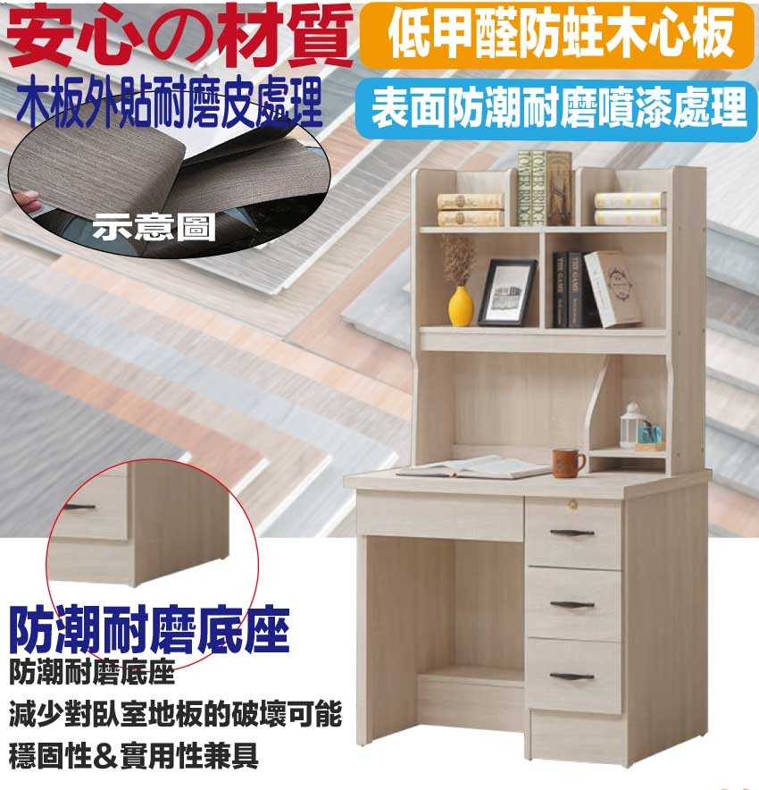 【綠家居】海星3尺四抽書桌組合 白梧桐木紋色系+安心材質製造,使用放心+搭配居家更便利,採用防蛀木心板+防潮耐磨底座+五金滑軌結構等安心材質製造 ,外層採用防潮耐磨噴漆處理搭配採用四抽屜+開放層格等收納空間設計,全由專人配送到家,專業安心服務,替你省下更多時間!