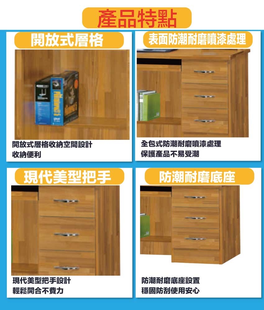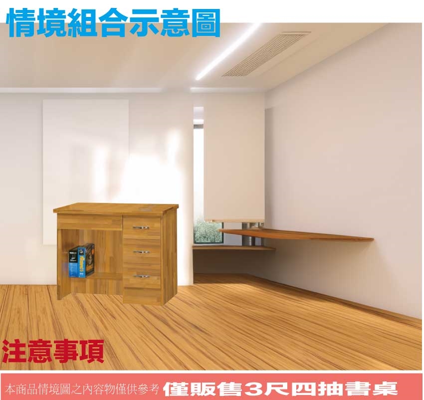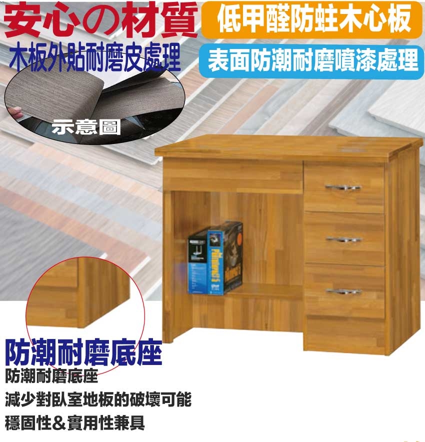 【綠家居】心語3尺四抽書桌 淺柚木紋色系+安心材質製造,使用放心+搭配居家更便利,採用防蛀木心板+防潮耐磨底座+五金滑軌結構等安心材質製造 ,外層採用防潮耐磨噴漆處理搭配採用四抽屜+開放層格等收納空間設計,全由專人配送到家,專業安心服務,替你省下更多時間!