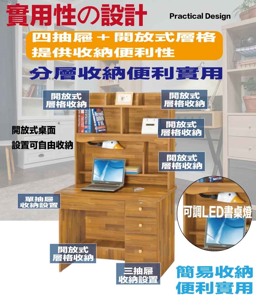 搭配採用可調式護眼燈架+四抽屜+開放層格等收納空間設計