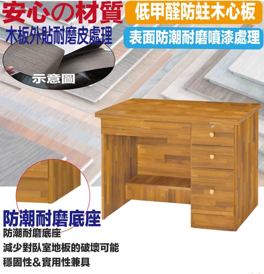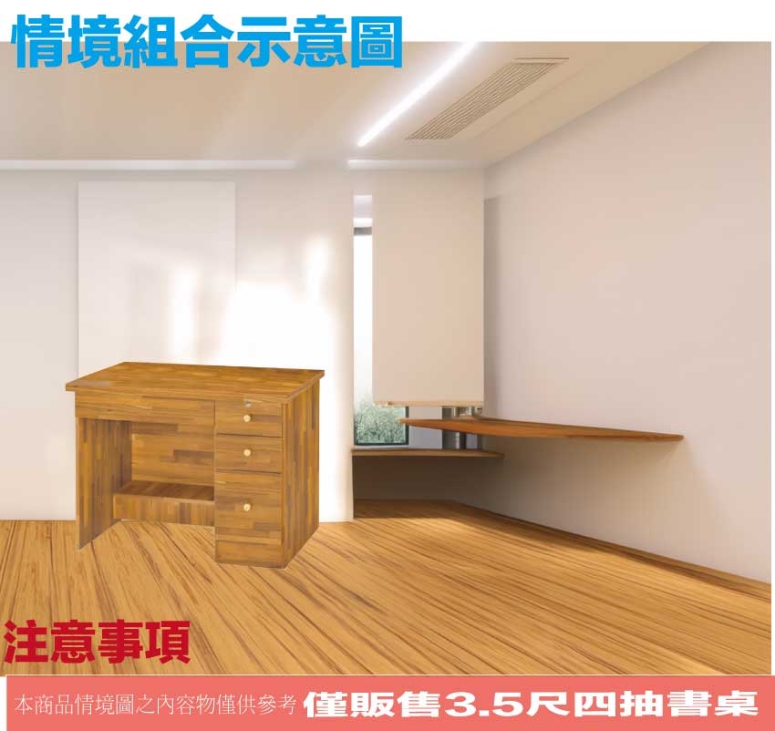 【綠家居】心語3.5尺四抽書桌 淺柚木紋色系+安心材質製造,使用放心+搭配居家更便利,採用防蛀木心板+防潮耐磨底座+五金滑軌結構等安心材質製造 ,外層採用防潮耐磨噴漆處理搭配採用四抽屜+開放層格等收納空間設計,全由專人配送到家,專業安心服務,替你省下更多時間!