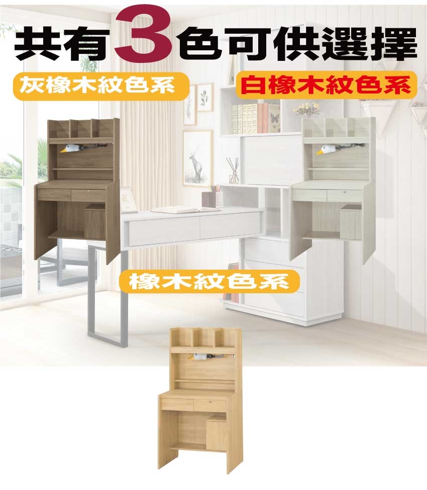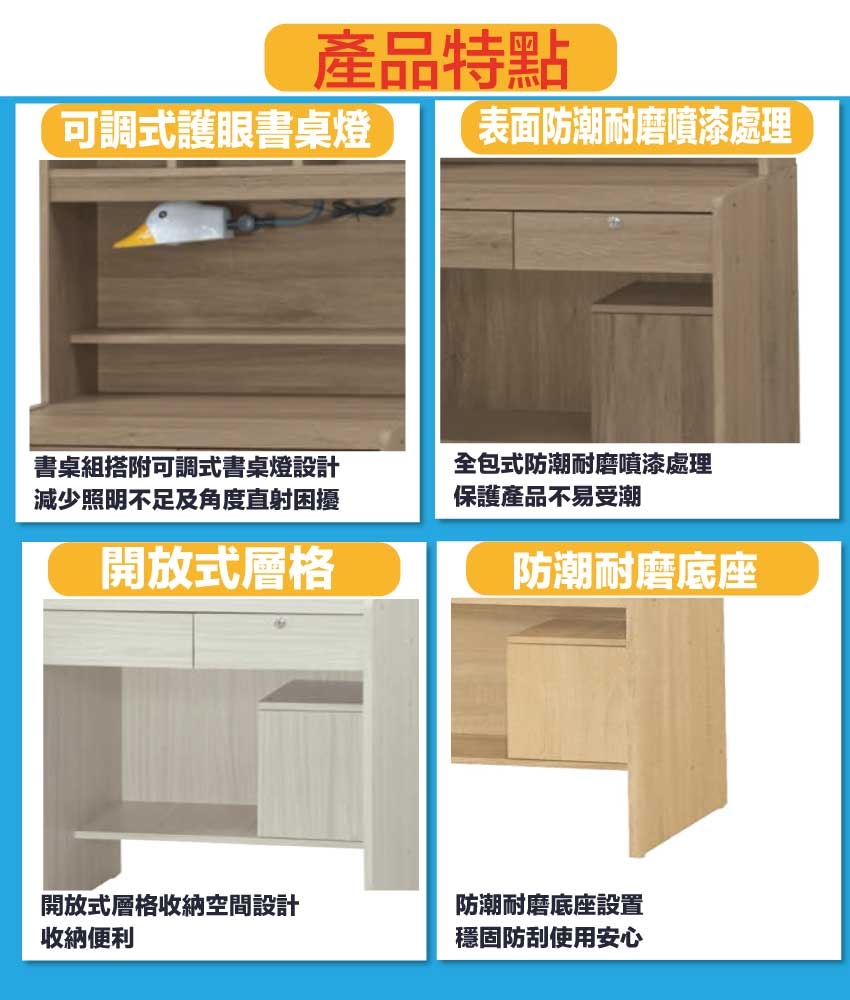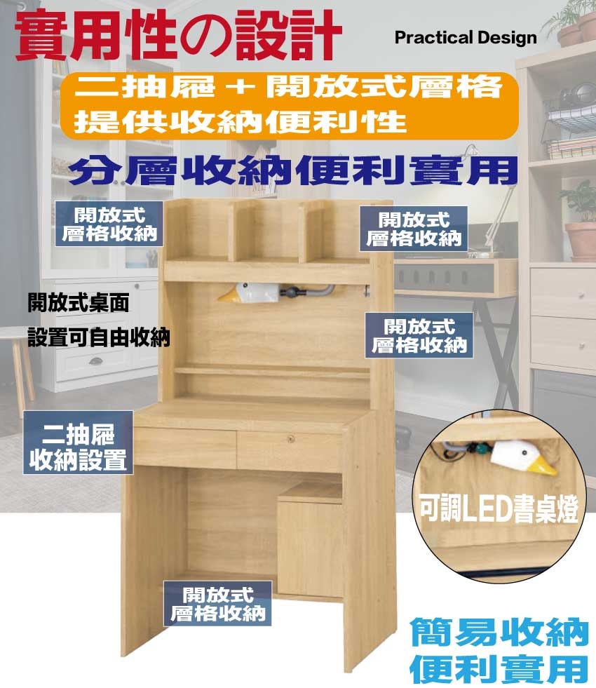 搭配採用可調式護眼燈架+二抽屜+開放層格等收納空間設計