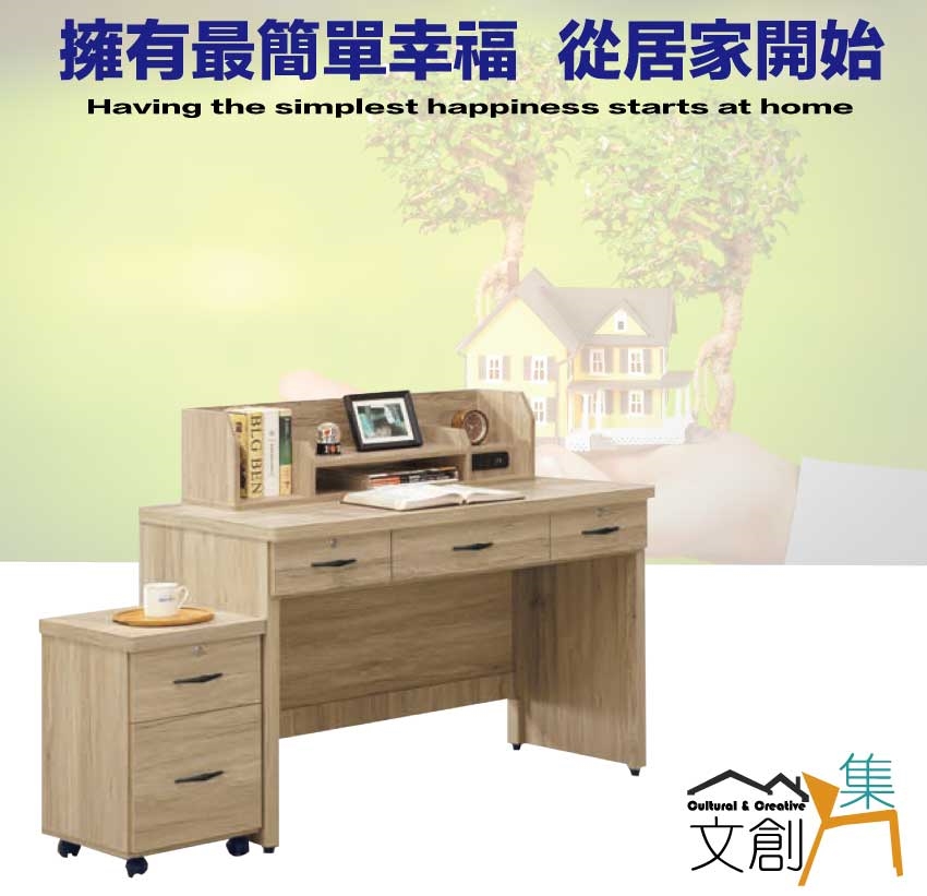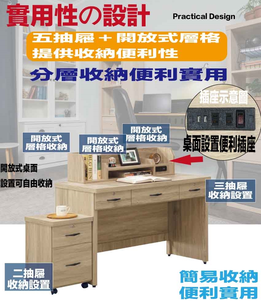 搭配採用桌上架附USB插座+五抽屜+開放層格等收納空間設計