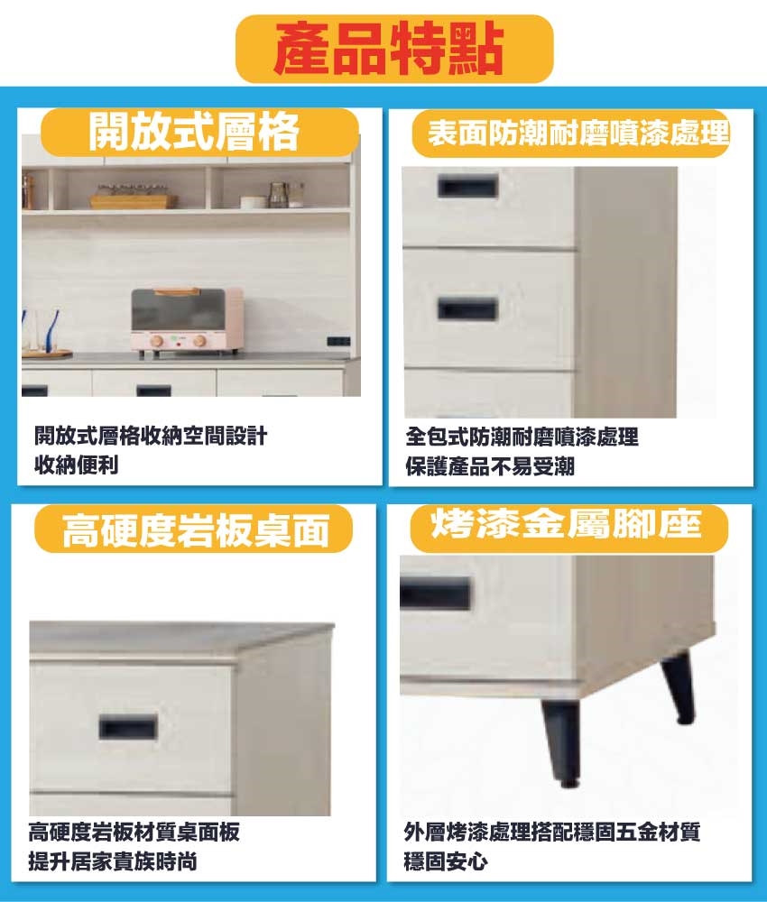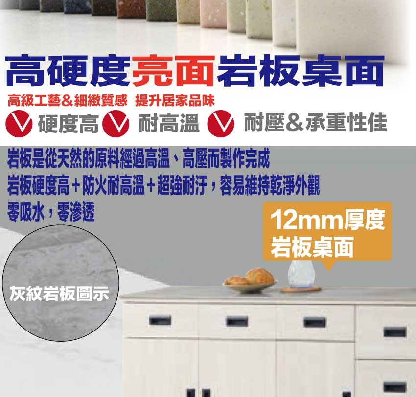 材質:防蛀木心板+烤漆五金腳座+五金滑軌結構+防夾手緩衝五金+12mm高硬度岩板桌面板