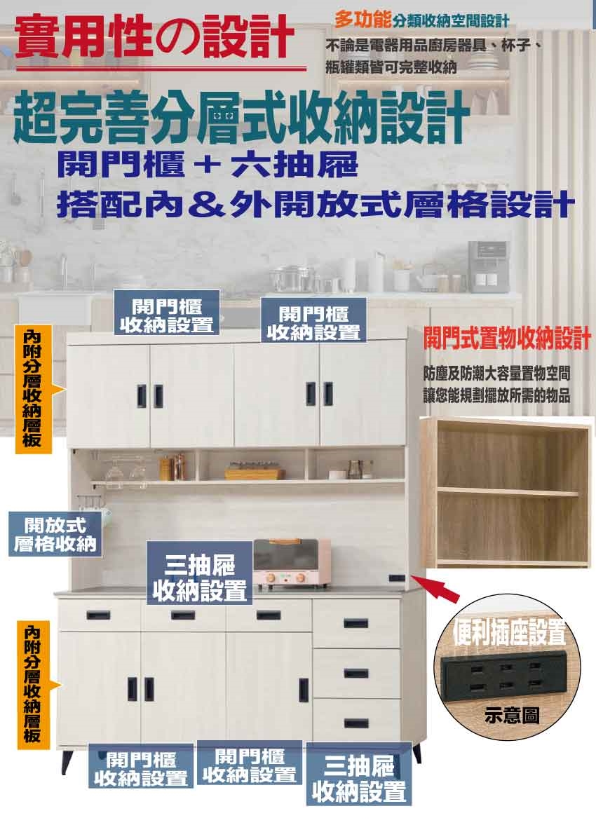 採用開門櫃+六抽屜+內&外開放層格等收納空間設計