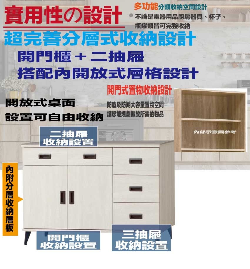 採用開門櫃+五抽屜+內&外開放層格等收納空間設計