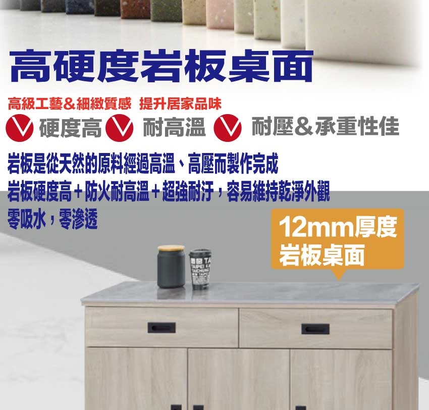 材質:防蛀木心板+烤漆五金腳座+五金滑軌結構+防夾手緩衝五金+12mm高硬度岩板桌面板