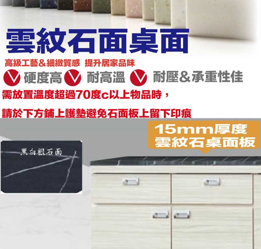 防蛀木心板+防潮耐磨底座+五金滑軌結構+防夾手緩衝五金+12mm高硬度岩板桌面板+15mm黑白紋石面板等安心材質製造