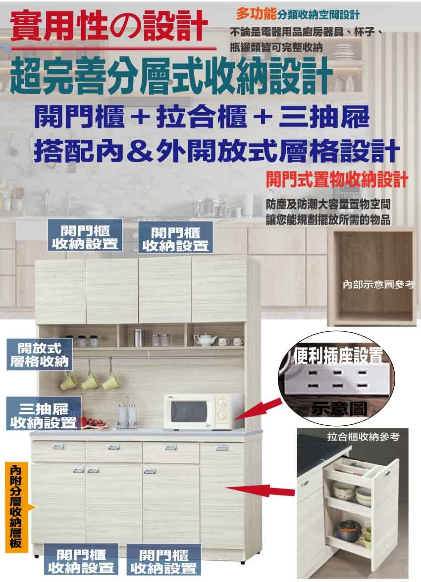 採用開門櫃+三抽屜+內&外開放層格等收納空間設計