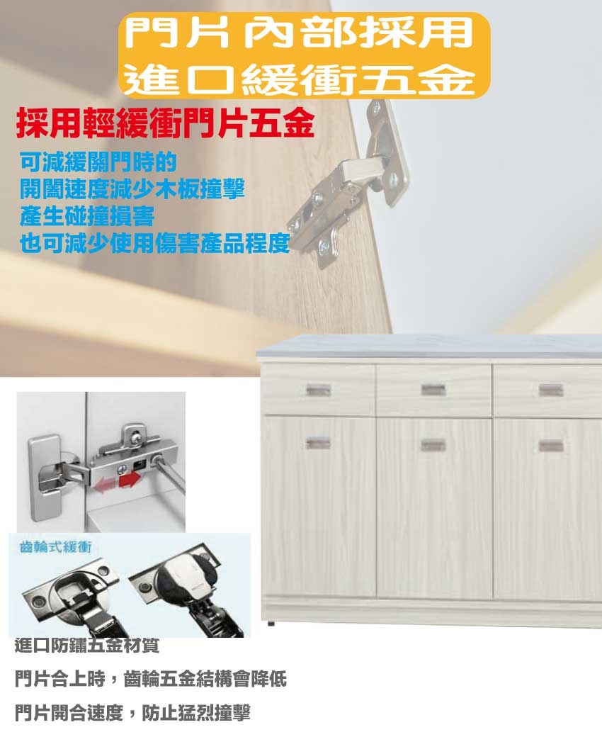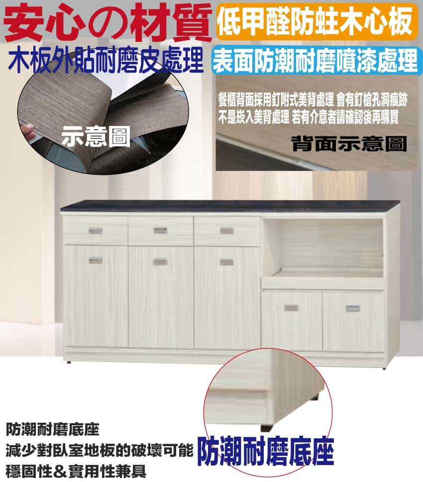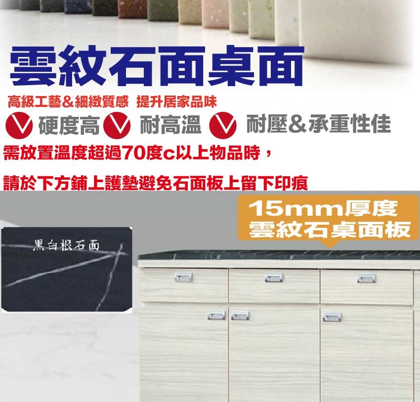 防蛀木心板+防潮耐磨底座+五金滑軌結構+防夾手緩衝五金+12mm高硬度岩板桌面板+15mm黑白紋石面板等安心材質製造