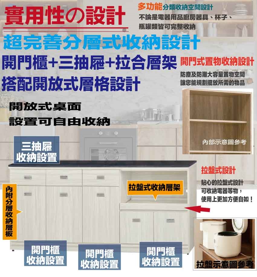 採用開門櫃+三抽屜+拉盤式層架+內&外開放層格等收納空間設計