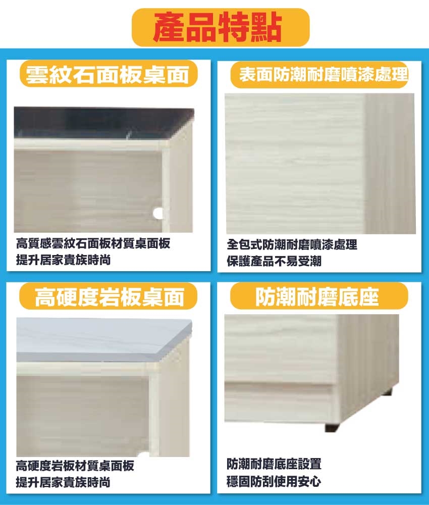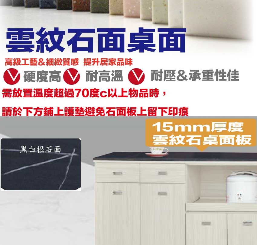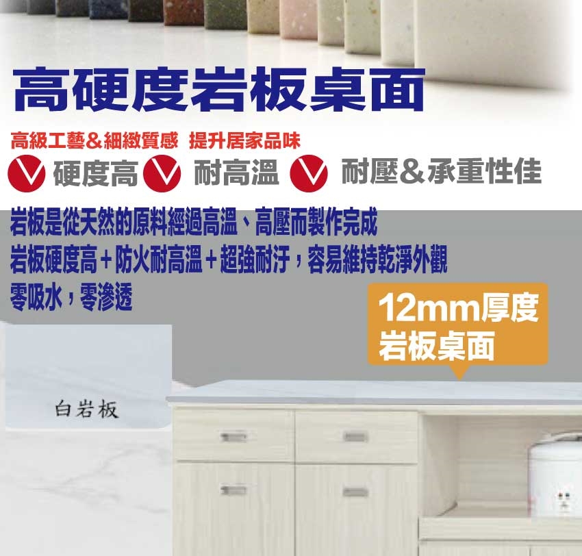防蛀木心板+防潮耐磨底座+五金滑軌結構+防夾手緩衝五金+12mm高硬度岩板桌面板+15mm黑白紋石面板等安心材質製造