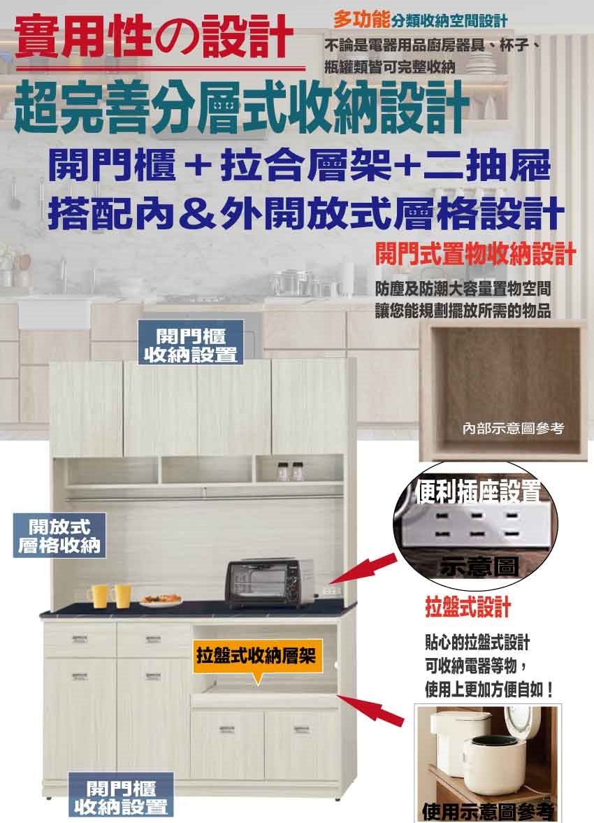 採用開門櫃+二抽屜+拉盤式層架+內&外開放層格等收納空間設計