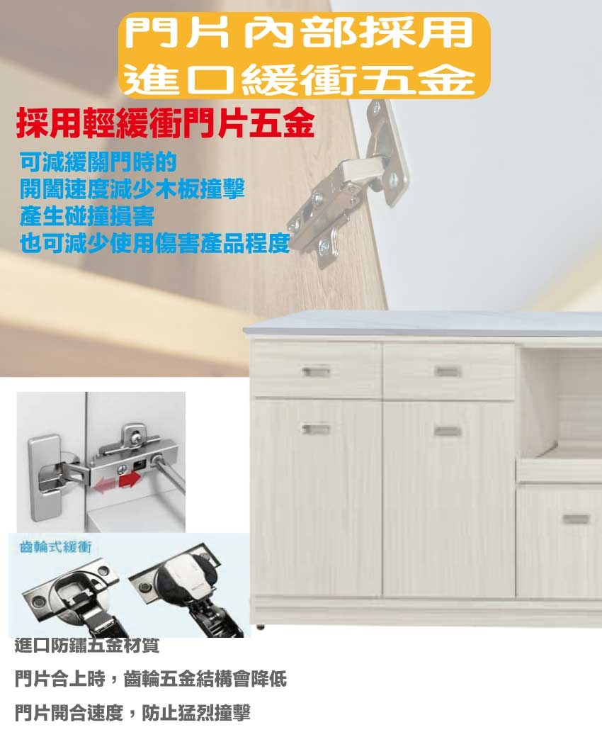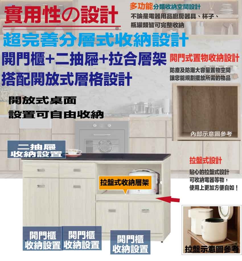 採用開門櫃+二抽屜+拉盤式層架+內&外開放層格等收納空間設計
