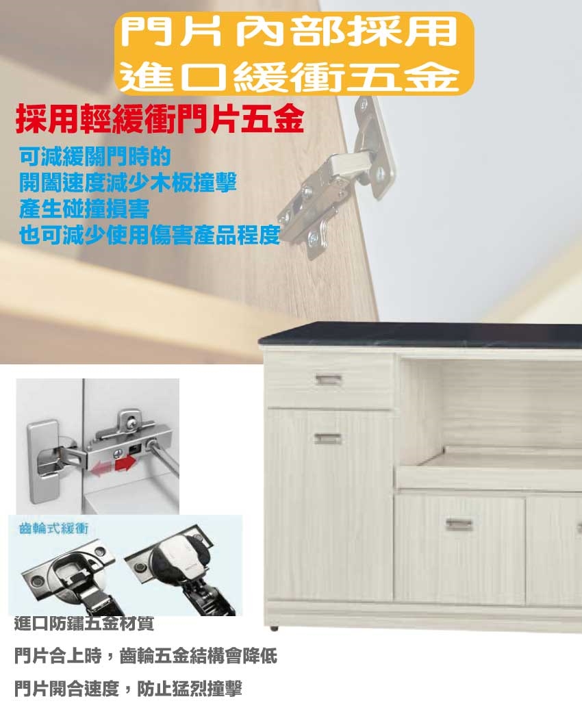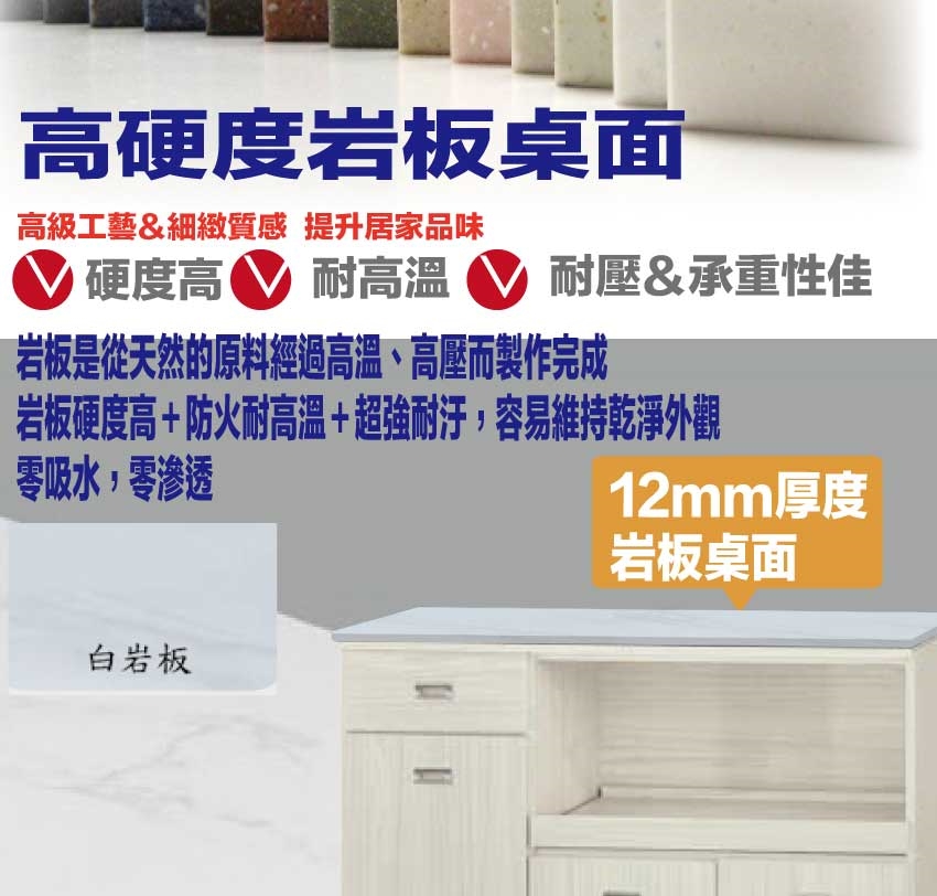 防蛀木心板+防潮耐磨底座+五金滑軌結構+防夾手緩衝五金+12mm高硬度岩板桌面板+15mm黑白紋石面板等安心材質製造