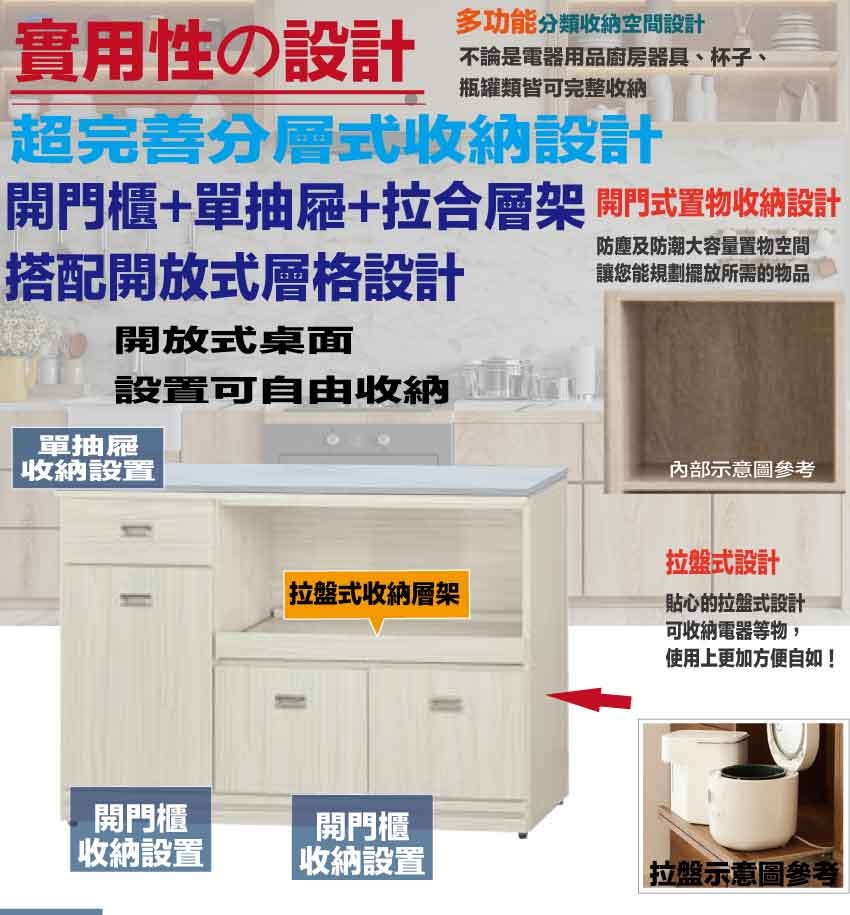 採用開門櫃+單抽屜+拉盤式層架+內&外開放層格等收納空間設計