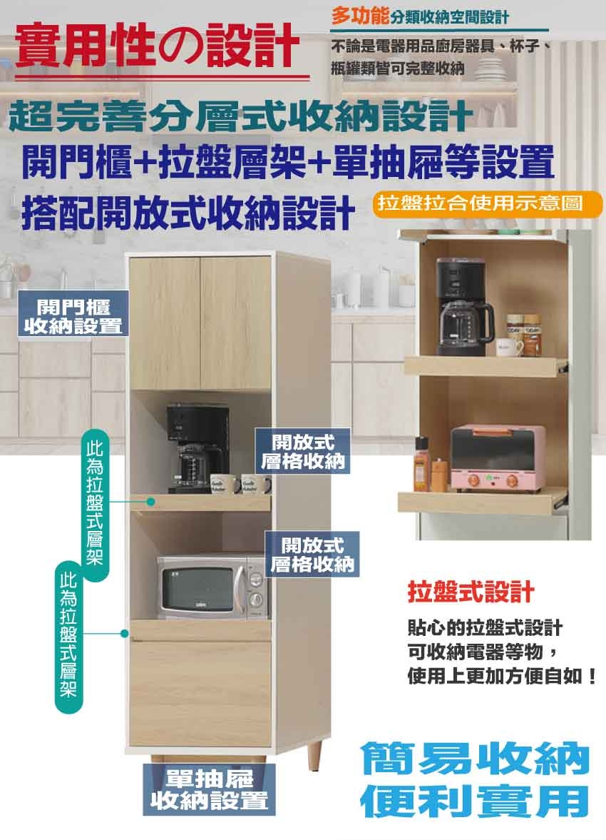 採用開門櫃+拉盤層架+二抽屜+內&外開放式層格等收納空間設計